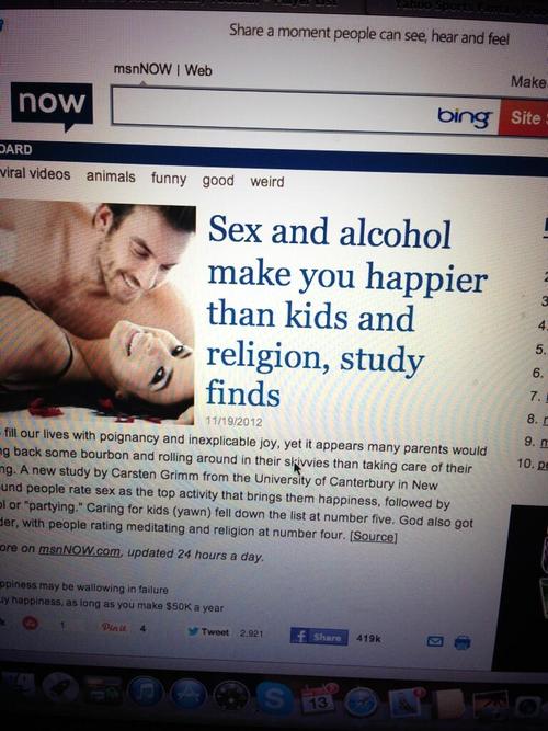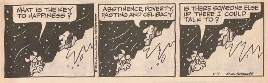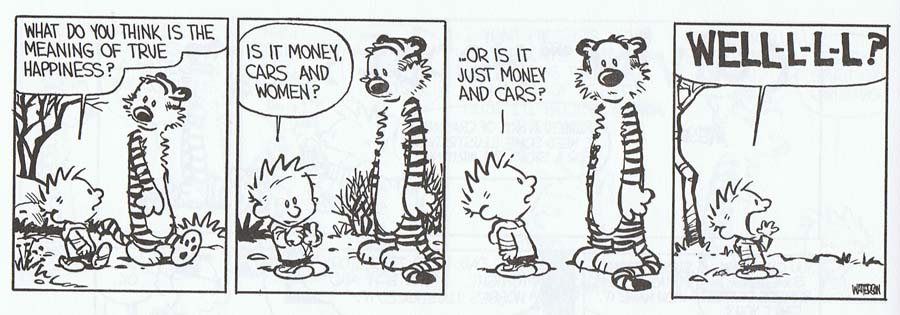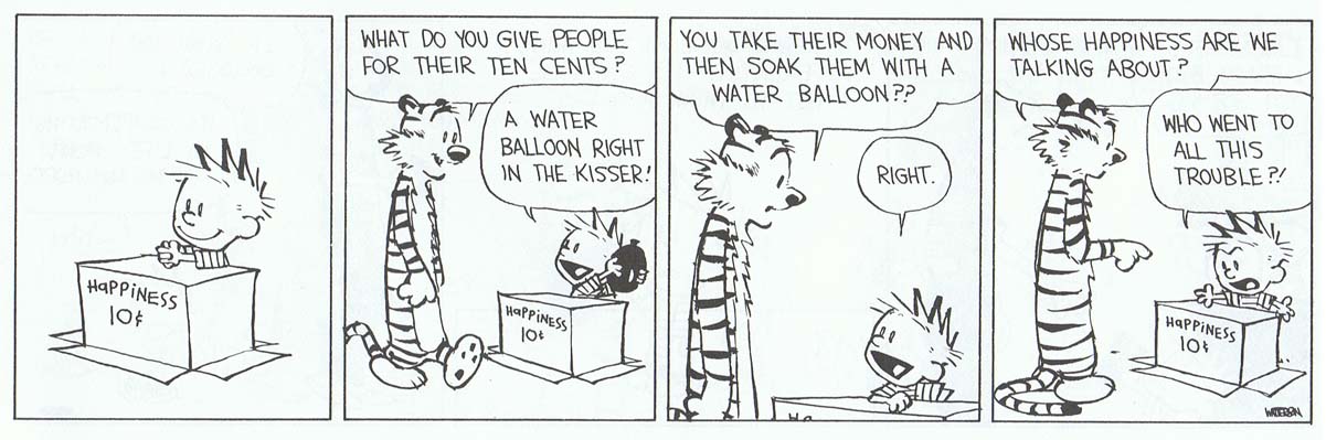 The New Testament mentions happiness just 7 times and never in a happy context. But we're not happy at the moment. "I'm happy" doesn't mean "I'm having fun". Remember all the fun you've had. When it was really fun it didn't end up making anybody very happy. "I'm happy" is equivalent to "I'm content" which means "I won't complain because no-one listens to me." The Declaration of Independence reads "Life, Liberty and the Pursuit of Happiness", not "Life Liberty and Whoopee".Choosing "pursuit" rather than plain "happiness" is a reminder of what happens to the poor suckers who, in their pursuit of happiness, catch the thing. America's legion of minor, temporary tabloid stars can tell the rest of the story, if they survive their stardom. Maybe they'd have been better to have left the word happy out of it altogether, then we cd say things like "Wealthy Birthday" "Drunken days are here again" and "Sexually aroused to meet you". Don't Vote It Just Encourages The Bastards