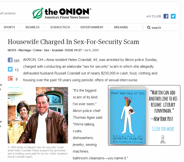 "Like a lot of men I've always put sex high on the list of domestic prerequisites, somewhere between food and basic cable, so I was surprised when trajectory of our sex life spiralled from nightly to weekly to "what's wrong with you". Woman's joke that ideal man will make love to you until midnight then turn into box of chocs - my wife wd skip the sex and go straight for the chocs. Each side yelling at each other "What's the Big Deal?" He meaning why can't we just have sex?, She meaning, why can't you stop bothering me? But without my resilient desire, what wd our marriage be? A book club? The Bastard On The Couch